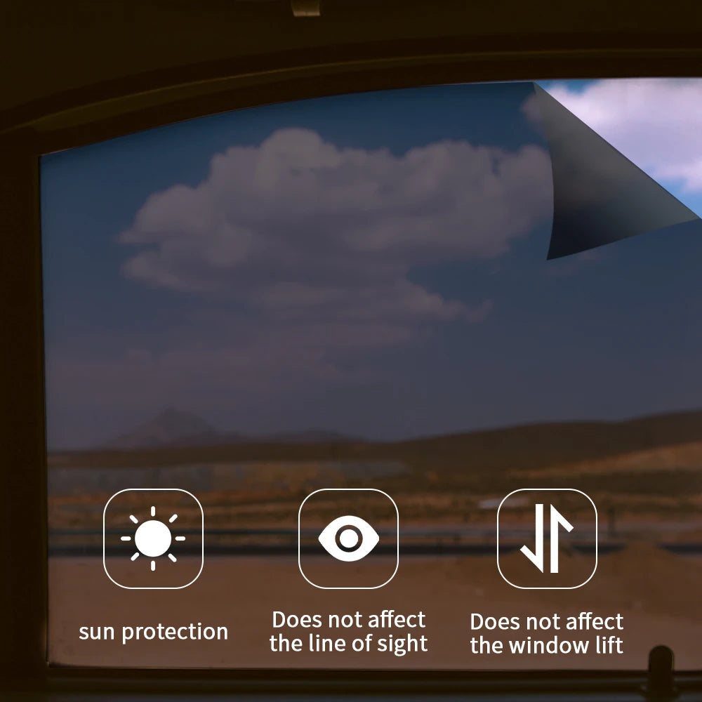 Simply attach using static electricity, no sticky residue, reusable, and easy to cut to fit your car’s windows or sunroof.