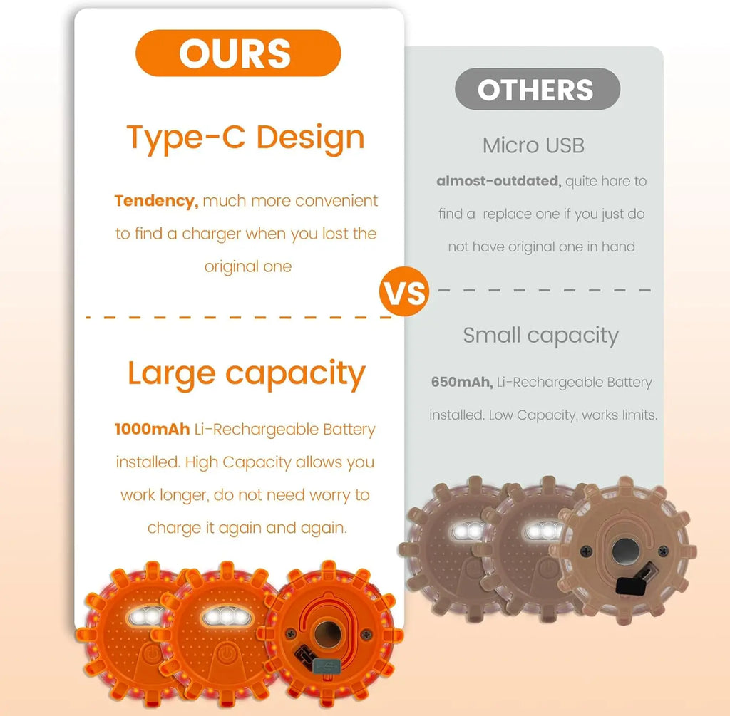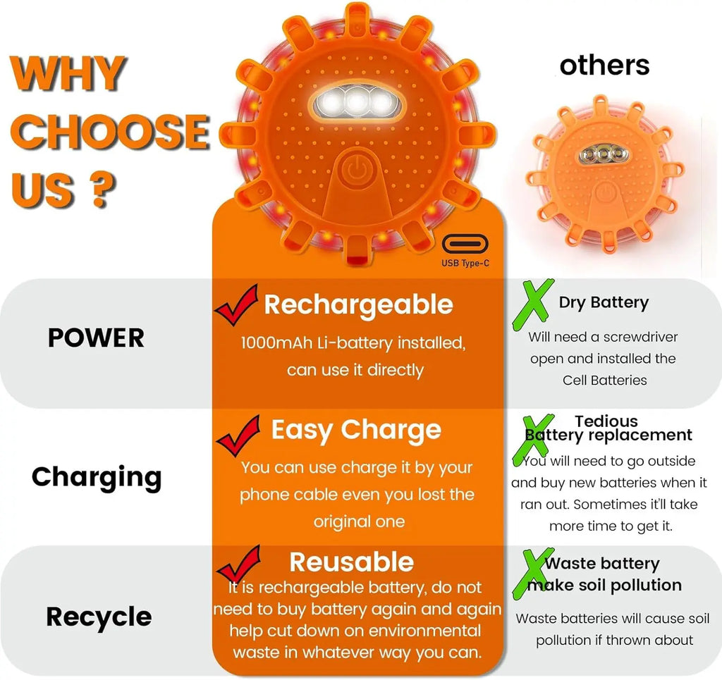 The durable, waterproof, and crushproof design ensures reliability in any weather. Equipped with a rechargeable 1000mAh lithium battery and Type-C charging, they provide long-lasting, hassle-free performance for roadside warnings, camping, hiking, and marine use.